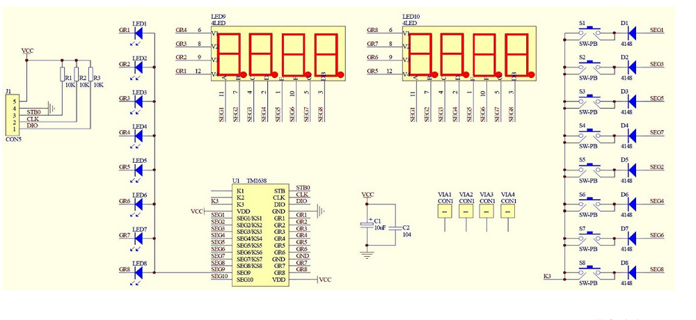 Modulet anvendes i chip TM1638, en samling af disse tre fælles MCU perifere kredsløb, den største feature er bare tage tre microcontroller IO port til kørsel, behøver ikke at scanne display og nøgle scanning microcontroller intervention, behøver kun at læse den relevante indskrive send display data eller test knap, Gem MCU ressourcer.